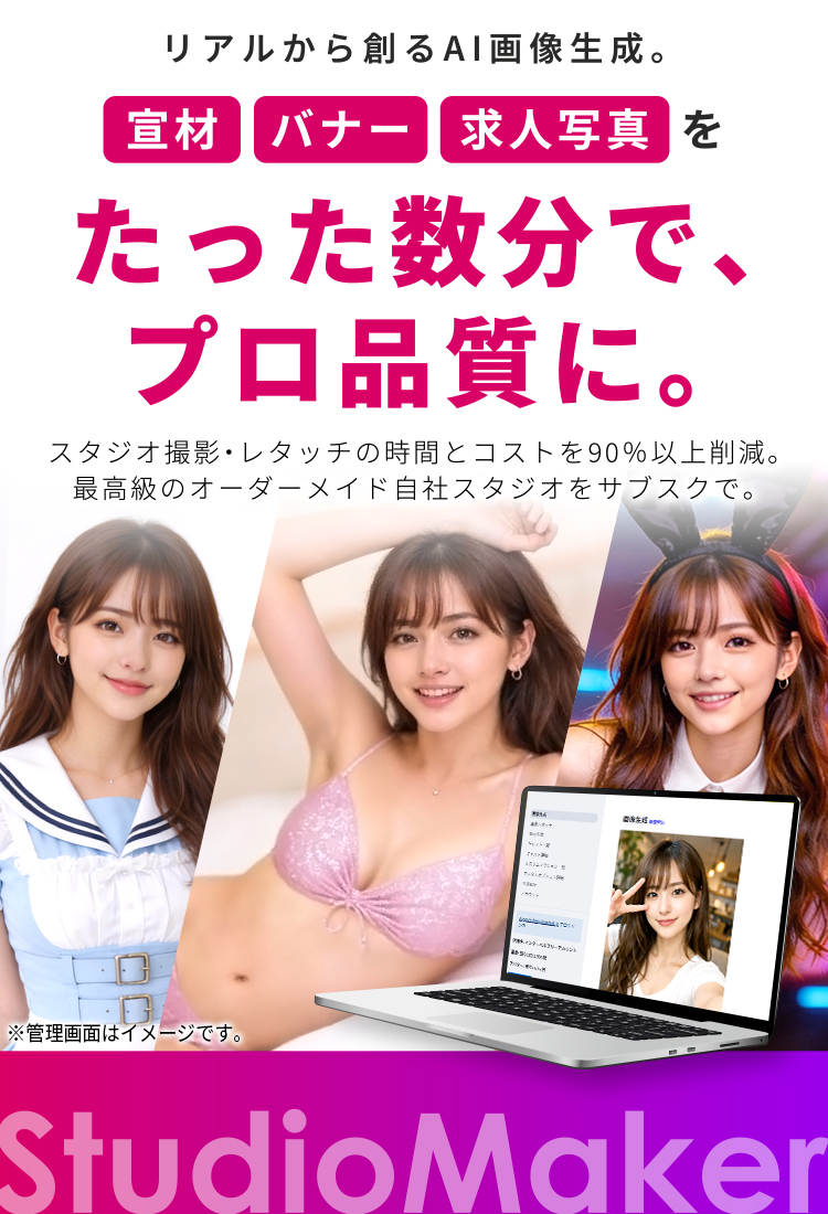 Studio Makerなら、バナーのコンセプトに合わせてこだわりの衣装、季節のコスプレなど、「あなたのお店の理想のこだわり」が驚くほどの低コストで実現可能です。